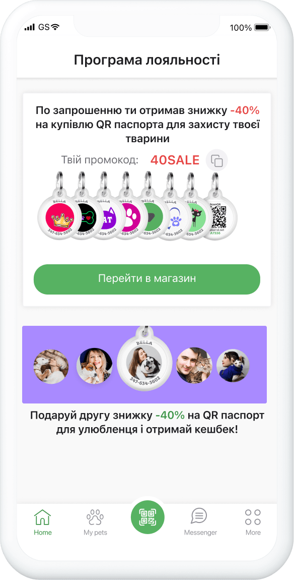 Вдягни QR паспорт на свою тварину. Сканування QR-коду відкриє доступ до онлайн-профіля тварини зі всією важливою інформацією, яку туди додано. А ти отримаєш сповіщення з геопозицією місця сканування.Ти можеш придбати QR паспорт у магазині.