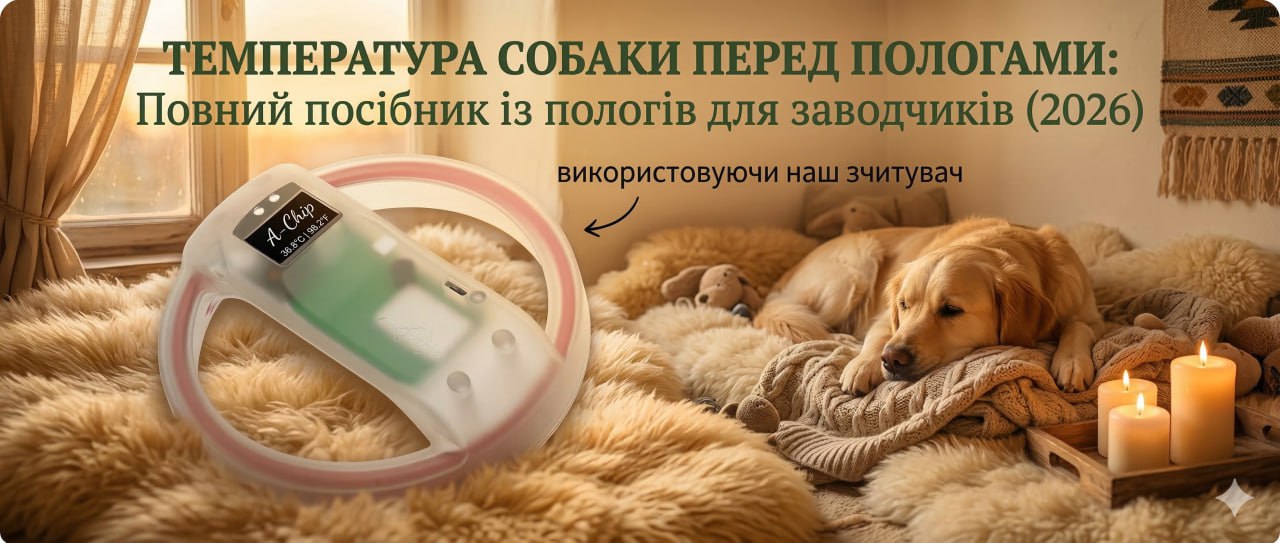 Стійке падіння нижче 37,2°C на двох послідовних вимірюваннях — пологи протягом 24 годин. Ректальний термометр працює. Але мікрочіп з термодатчиком прибирає стрес: безперервний моніторинг, сповіщення на телефон і дані для аналізу кожного помету.